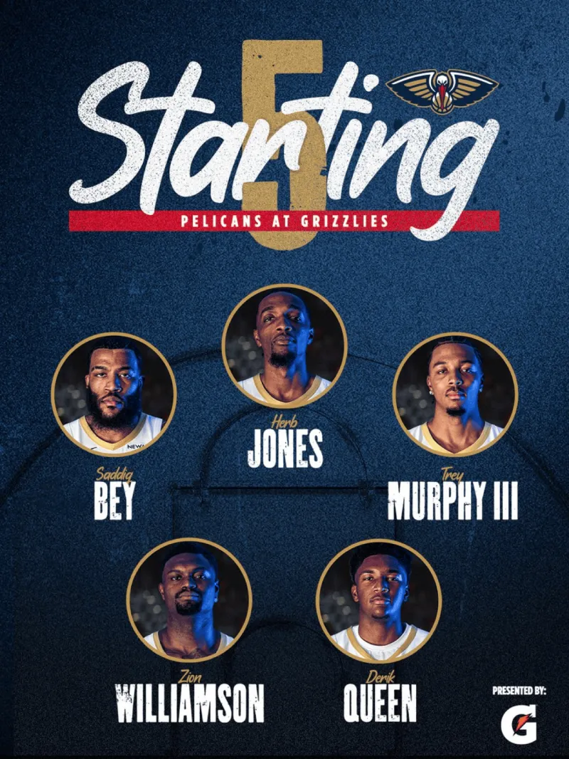 鹈鹕今日首发:墨菲、赫伯特-琼斯、蔡恩、奎因、贝